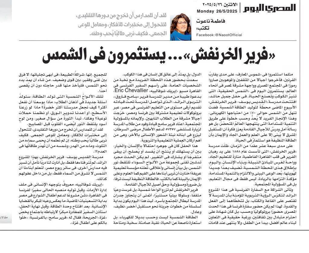 Avec ce projet pionnier, l’école Saint Joseph a non seulement illuminé sa cour, mais a également illuminé un chemin que nous espérons que d’autres écoles suivront, dans toute l’Égypte. Apprenons à nos enfants que le soleil ne se lève pas seulement du ciel, mais aussi de l’intérieur de leur esprit.