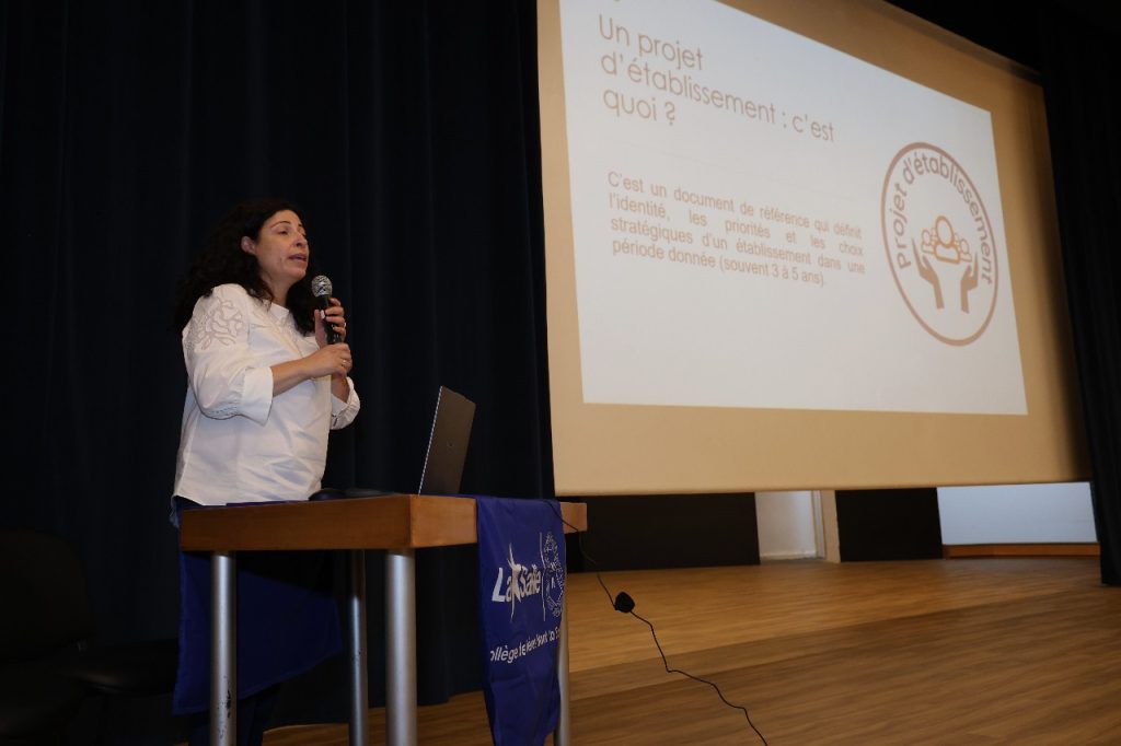 La rencontre s’est achevée par des interventions sur trois projets institutionnels à mener collectivement durant cette année : Mme Maya Chaaya a présenté les fondements du Projet d’établissement qui devrait être validé en janvier 2026, Mme Carole Dayé a souligné que l’orientation scolaire est l’affaire de tous, et Mme Guilda Raad a informé l’audience autour de la demande de labellisation du Niveau 3 de l’Education au Développement Durable.