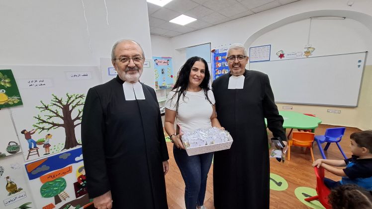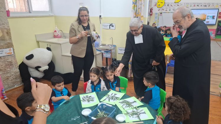 Afterward, Brother Habib visited the kindergarten, where Ms Rubina Saadeh welcomed him, and the students were celebrating the Olive Festival. He observed several activities related to olives and olive oil, appreciating the students’ enthusiasm and creativity.