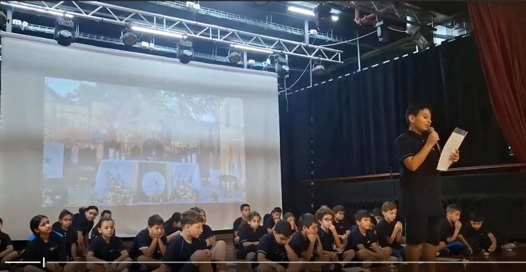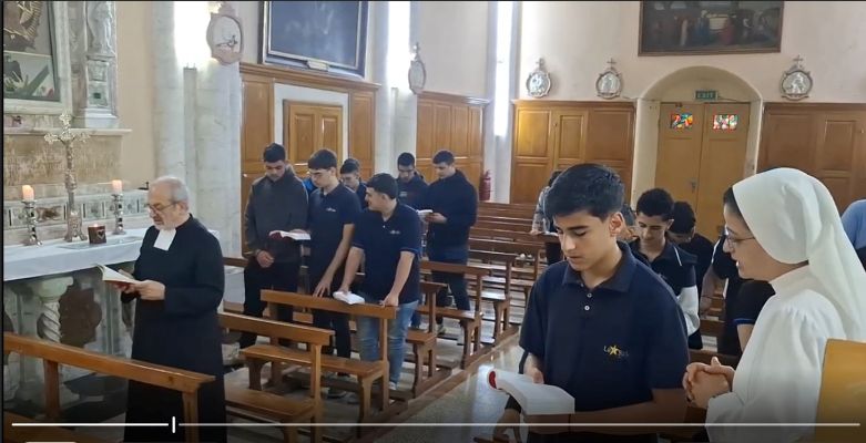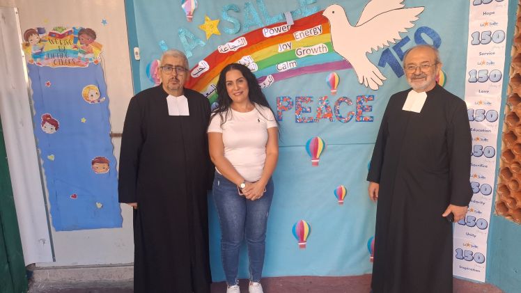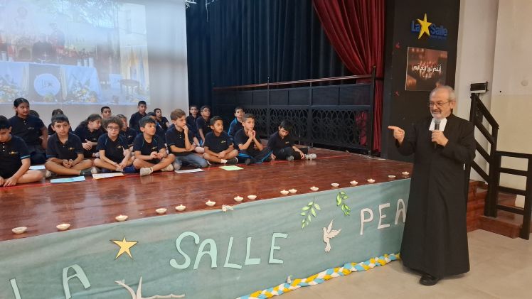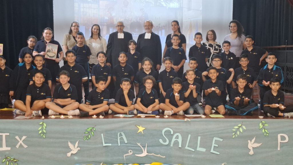 The visit continued with a Holy Mass celebrated by Father Rami Asakreh, followed by a short student performance about peace prepared by the 4th-grade students. Ms. Muna welcomed the Brother Visitor, and Ms. Claire Ghazawi trained the students for the performance.