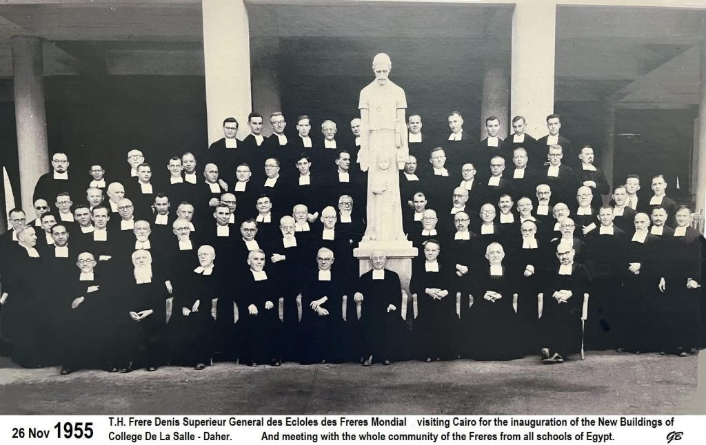 An exceptional HD Group photo of the Freres community of all Freres Schools of Egypt, grouped to celebrate the inauguration of the new buildings of College De La Salle Daher Cairo on Nov 26, 1955, in the presence of « Tres Honore Frere Denis / Vicaire General de L’Institut des Freres Mondiale (on visit to Egypt for that occasion). »