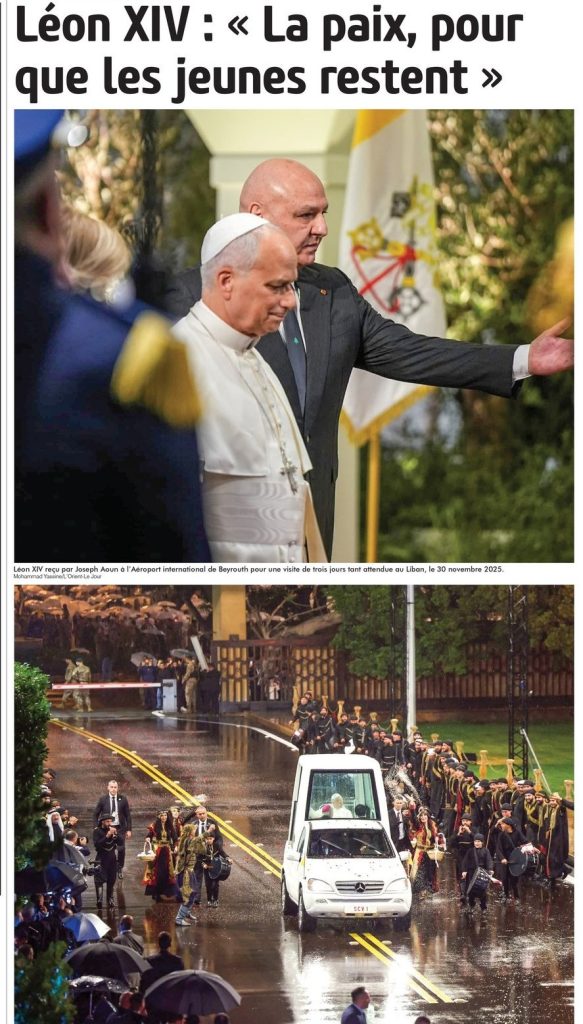 Sitôt la fervente cérémonie protocolaire achevée, le long convoi s’élance pour rejoindre le palais présidentiel de Baabda. Sur la route, de grandes affiches du Pape ont été accrochées. En traversant la banlieue sud de Beyrouth, l’effigie de l’homme en blanc côtoie les grands portraits de Hassan Nasrallah, l’emblématique figure du Hezbollah, tué par une frappe israélienne en septembre 2024. L’organisation chiite qu’Israël entend détruire a souhaité la bienvenue au Pape. Samedi, elle déclarait dans une lettre compter sur son soutien pour rejeter « l’injustice et les attaques » israéliennes. Sur le parcours, des jeunes scouts affiliés au Hezbollah jouent d’ailleurs du tambour, rapporte le quotidien L’Orient Le Jour.