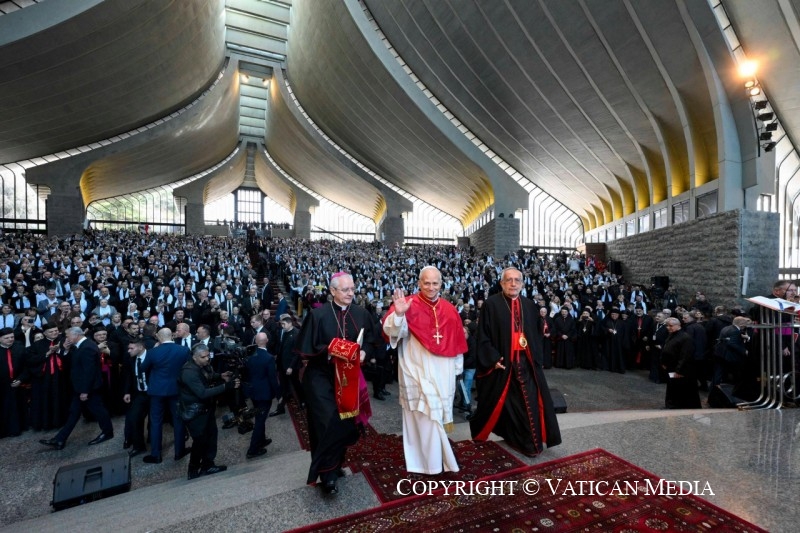 Salutation du pape Léon XIV lors de la rencontre avec les évêques, les prêtres, les hommes et femmes consacrés et les agents pastoraux
