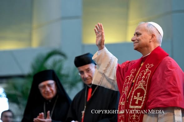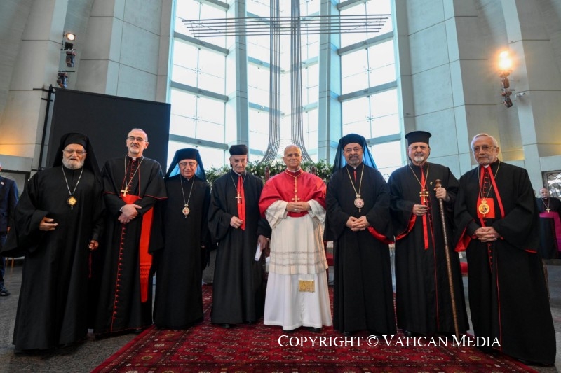 C’est avec une grande joie que je vous rencontre au cours de ce voyage, dont la devise est « Heureux les artisans de paix » (Mt 5, 9). L’Église au Liban, unie dans ses multiples visages, est une icône de ces paroles. Saint Jean-Paul IIl’affirmait, lui qui était si attaché à votre peuple. Il disait : « Dans le Liban d’aujourd’hui, vous êtes responsables de l’espérance » (Message aux citoyens du Liban, 1er mai 1984) ; et il ajoutait : « Créez, là où vous vivez et travaillez, une ambiance fraternelle. Sans ingénuité, sachez faire confiance aux autres et soyez inventifs pour faire triompher la force régénératrice du pardon et de la miséricorde » (ibid.).