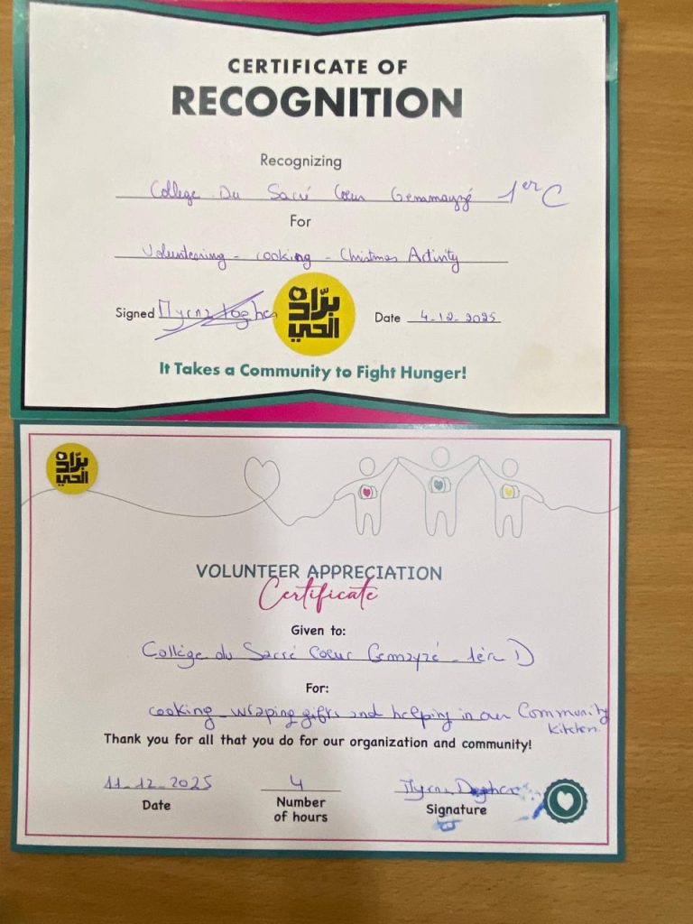 Le Service Socio-Pastoral du Collège a organisé à l’intention des élèves des classes de 1re C et D une journée d’engagement citoyen et social auprès de l’ONG Berrad El Hay, une association qui soutient de nombreuses familles en difficulté en offrant quotidiennement des plats chauds, ainsi que des petits-déjeuners aux enfants déplacés et démunis des écoles gouvernementales.