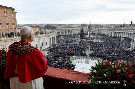 « Tous ensemble, réjouissons-nous dans le Seigneur : notre Sauveur est né sur terre ! Aujourd’hui, pour nous, descend du ciel la paix véritable » (Antienne d’ouverture de la messe de la nuit de Noël). Ainsi chante la liturgie dans la nuit de Noël, et ainsi résonne dans l’Église l’annonce de Bethléem : l’Enfant né de la Vierge Marie est le Christ Seigneur, envoyé par le Père pour nous sauver du péché et de la mort. Il est notre paix, Celui qui a vaincu la haine et l’inimitié par l’amour miséricordieux de Dieu. C’est pourquoi « la Nativité du Seigneur est une Nativité de paix » (Saint Léon le Grand, Sermon 26).