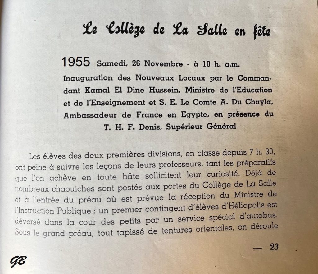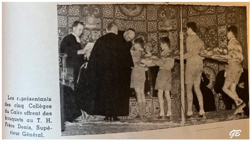 In the presence of Commandant Kamal El-Din Hussein Minister of Education, S.E. Le Comte A. Du Chayla Ambassadeur De France, T.H. Frere Denis Superieur General Worldwide, C. Frere Andre-Leon Directeur DLS & Khoronfish, The Committee of the Amicale & Freres of Egypt, many distinguished Guests, and the students of Les Ecoles Des Freres in Cairo.