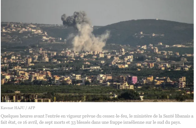 « Il faut tout faire pour que le cessez-le-feu soit respecté (…) La situation libanaise est absolument dramatique », a réagi sur TF1 la ministre des armées, Catherine Vautrin, alors que la France est tenue à l’écart des négociations de paix par Israël. Emmanuel Macron a lui aussi exprimé sur X sa « préoccupation » que le cessez-le-feu « puisse d’ores et déjà être fragilisé par la poursuite d’opérations militaires. » Le président français « demande la sécurité pour les populations civiles des deux côtés de la frontière entre le Liban et Israël. Le Hezbollah doit renoncer aux armes. Israël doit respecter la souveraineté libanaise et arrêter la guerre. »